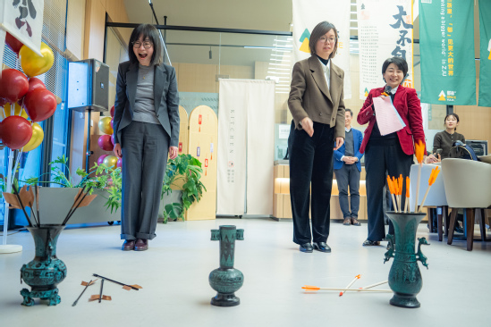 最后来到互动茶趣环节。在赵瑜老师的主持下,原地踏步、投壶和词语接龙三个游戏依次进行,现场热闹非凡、笑声不断,具有深厚中国传统文化内涵的投壶游戏更是颇得各位老师青睐,将茶会氛围推至高潮。